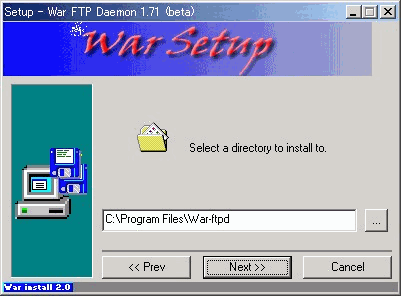 WarFTPdのインストールそのものについては、下記のとおりNT系と全く同じ方法で問題ありません。但し、ひとつだけ注意点があります。それは、最後のインストールフェーズのところが非常に時間がかかり、一瞬固まってしまったのかと思えますがじっくりと待ってください。インストールされるはずです。