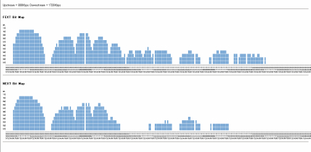 FEXTが若干デコボコしたり、ビット数が少なくなっているが、全域に渡ってサブキャリアがあるのに対して、NEXTの下りのサブキャリアは136番から154番に少しあるだけでほとんどない他、ビット数も非常に少ない。これは何を意味しているのか?これは、典型的なISDNによる干渉と思われる。日本のISDNは2.5msの間に上りと下りを交互に伝送するピンポン伝送方式を採用しているため、FEXTとNEXTが1.25msごとに切り替わる。NEXTだけキャリアがほとんどないということは、非常に強いISDNの干渉を受け、家庭側のISDN端末が送信する周期では、ほとんど送信できない状態になっていることを意味している。90番から135番まで全くサブキャリアがないが、ISDNの弱い干渉ならこの領域は軽い谷になるだけですむはずである。