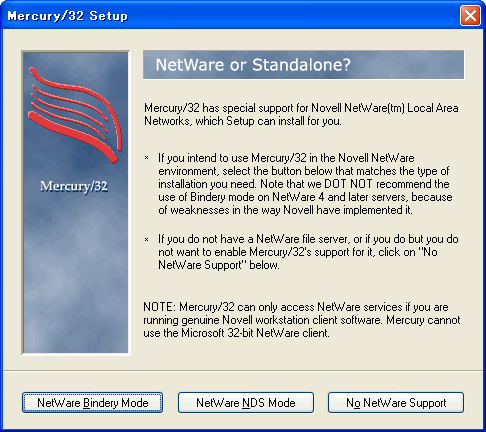 5. NetWareベースで動かすかスタンドアローンで動かすかを選択する。ここではWindowsXP環境なので「No NetWare Support」を選択。