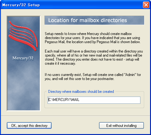 8. ここでは、メールボックスのディレクトリを指定する。特に要件がなければデフォルトのまま「OK, accept this directory」を選択。