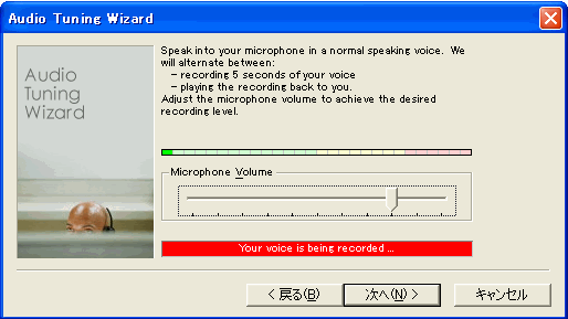 4. マイクのボリューム調整を行う。自動で5秒毎に録音と再生を繰り返しているので、下のアナウンス部分が赤(Your voice is being recorded...)のときに、しゃべってて録音し、再生音量を聴きながらマイクのボリューム調整を行う。完了したら「次へ」をクリックする。